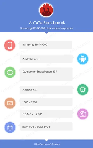 براساس اطلاعات منتشر شده در AnTuTu گلکسی نوت 8 با دقت تصویر 1080 در 2220 پیکسل مورد آزمایش قرار گرفته است. در واقع میتوان دقت تصویر این گوشی را تغییر داد و آن را به حداکثر 1440 در 2960 پیکسل رساند. همچنین مشخص شد که نوت 8 به 6 گیگابایت رم مجهز شده و 64 گیگابایت حافظه داخلی دارد. دوربین پشت آن 12 مگاپیکسلی خواهد بود و دوربین جلوی 8 مگاپیکسلی دارد. اندروید 7.1.1 هم روی آن نصب شده است.