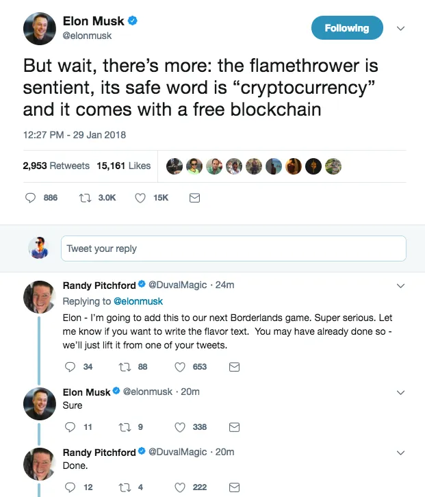 ایلان ماسک یکی پس از دیگری درباره‌ی آتش‌افکن خود توییت ارسال می‌کرد؛ توییت‌هایی که مثل دیگر گفته‌های‌اش، بیشتر جنبه‌ی شوخی دارند. در این میان، رندی پیچ‌فورد به ایلان ماسک گفت که این سلاح را در Borderlands بعدی قرار خواهد داد. او حتی به ایلان ماسک گفت که متن توضیح این سلاح را هم برای‌شان بنویسد. ایلان ماسک هم این موضوع را قبول کرد.