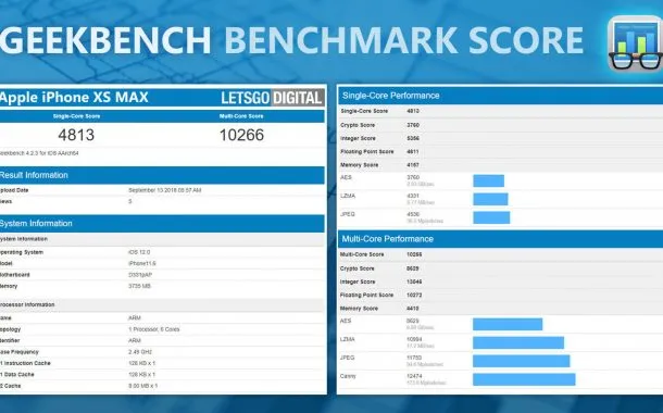 در مورد گرانترین مدل یعنی آیفون XS مکس هم نتایج آزمایش تکهستهای آن با گرفتن امتیاز 4813 تقریبا مشابه آیفون XR است. البته تفاوت آنها در زمینهی آزمایش چندهستهای حدود 1000 امتیاز است و این گوشی موفق به اخذ امتیاز 10266 شده است. البته برخلاف آیفون XR، گوشی آیفون XS مکس از 4 گیگابایت حافظه رم بهره میبرد. هرچند هنوز آیفون XS بنچمارک نشده، اما با توجه به اینکه قطعات داخلی این دو گوشی یکسان است، پس میتوانیم انتظار نتایج بنچمارک یکسانی را داشته باشیم.