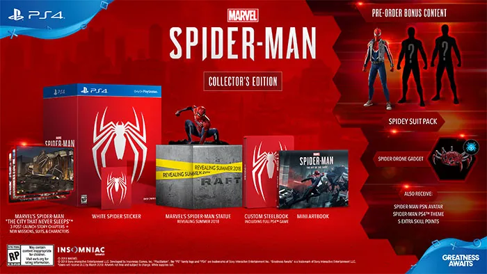 اسپایدرمن روز ۷ سپتامبر برای پلیاستیشن۴ عرضه میشود. با پیش خرید بازی سه لباس بیشتر برای اسپایدرمن دریافت میکنید. بازی همچنین یک نسخهی کلکسیونی دارد که به همراه مجسمهی اسپایدرمن عرضه میشود.