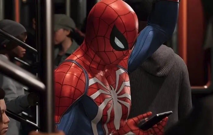 - اسپایدرمن برای سفر سریع در شهر، مترو سوار میشود.
