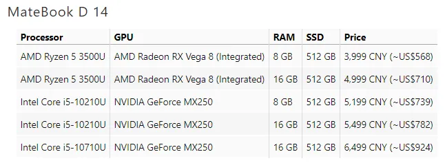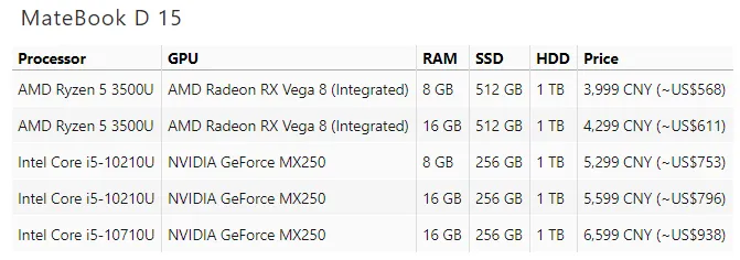 لپتاپهای جدید هواوی سری Matebook D در دو مدل ۱۴ و ۱۵ اینچی که به ترتیب ۲۵۶ و ۵۱۲ گیگابایت فضای ذخیرهسازی داخلی دارند، معرفی شدند. بهروزرسانیهای قابل توجه در این دو محصول، استفاده از پردازندههای AMD Ryzen 5 3500U در مقایسه با مدل AMD Ryzen 2500U است. در حالی که پردازشگر گرافیکی Radeon RX Vega 8 نیز در این دو محصول استفاده شده.