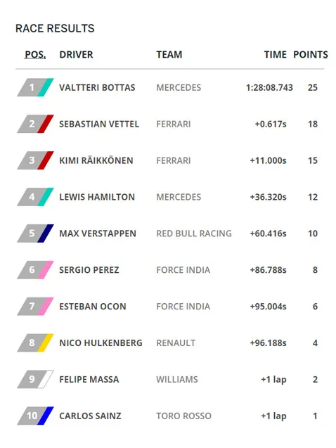 بوتاس با ثبت زمان 1:28:08:743 (یک ساعت و 28 دقیقه و 8 ثانیه و 743 هزارم ثانیه) در جایگاه اول ایستاد. دو قرمز پوش تیم فراری یعنی فتل و رایکنن هم به ترتیب با اختلاف زمانی 0.617 و 11 ثانیه، مقامهای دوم و سوم را از آن خود کردند. لوییس همیلتون، راننده مرسدس با اختلاف زمانی زیاد 36.320 ثانیه، در جایگاه چهارم مسابقه دیروز قرار گرفت. با توجه به نتایج بدست آمده در مرحله تعیین خط، سباستین فتل، کیمی رایکنن و والتری بوتاس در موقعیتهای اول تا سوم استارت مسابقه جایگیری کردند.
