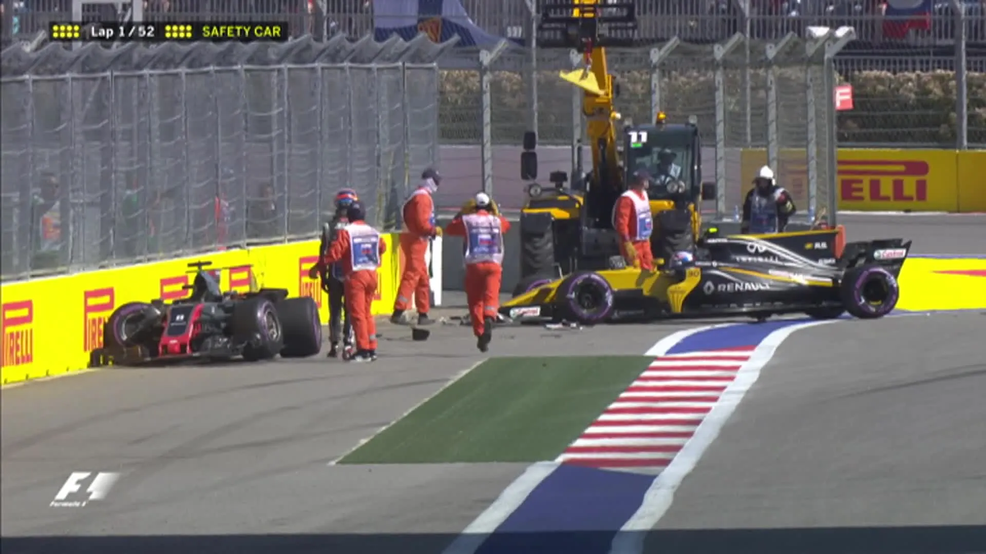 لنس استرول، راننده تیم ویلیامز پس از برخورد با نیکو هالکنبرگ (Nico Hulkenberg)، راننده تیم رنو، اسپین شد. اگرچه این اسپین باعث حذف استرول نشد اما موجب شد تا این راننده کانادایی زمان زیادی را از دست بدهد. هالکنبرگ و لنس استرول در پایان این مسابقه، به ترتیب در مقامهای هشتم و یازدهم قرار گرفتند. رومین گروژان، راننده تیم هاس و ژولیان پالمر از تیم رنو، با برخورد شدیدی که با هم در پیست مسابقه داشتند، مجبور به ترک این رقابت شدند. این برخورد باعث شد تا خودرو Safety Car حضور پیدا کند و خودروها برای سه دور آرام حرکت کنند. ترمزهای خودرو دنیل ریکاردو، راننده تیم ردبول، در مسابقه مشکل پیدا کرد. این مشکل در نهایت باعث شد تا دنیل از این رقابت کنارهگیری کند. در این کلیپ کوتاه میتوانید بخشهایی هیجانانگیز از این رقابت را ببینید.
