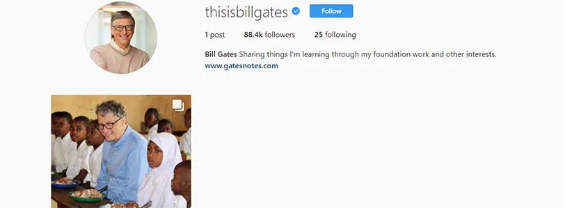 اینستاگرام یک عضو تازه پیدا کرده. صبح جمعه «بیل گیتس» موسس شرکت مایکروسافت به این شبکه اجتماعی پیوسته است. بیل گیتس فعالیت خود در این شبکه به اشتراکگذاری تصویر را با نام کاربری «thisisbillgates» آغاز کرد (نام کاربری «billgates» قبلا در اینستاگرام استفاده شده بود). اولین پست اینستاگرام بیل گیتس یک اسلایدشو شامل 3 تصویر از تانزانیا بود.