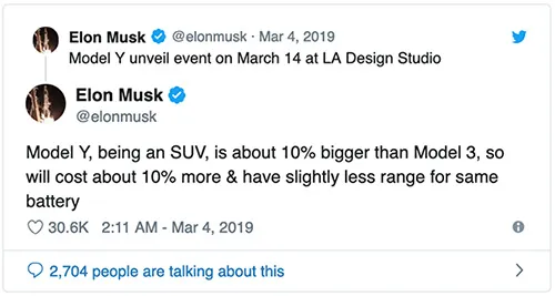 تسلا تا به حال تنها یک تصویر تیزر از خودروی مدل Y منتشر کرده که آن را در ابتدای پست می‌توانید مشاهده کنید. جدا از این عکس، این شرکت درباره این خودرو، سالهاست که صحبت می‌کند. در سال 2015 اولین باری بود که ایلان ماسک در یک توییت، به صورت تصادفی نام این خودرو را فاش کرد و پس از آن اگرچه وی توییت خود را پاک کرد اما در نهایت مشخص شد که نام این خودرو قرار است مدل Y باشد.