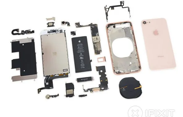 برای باز کردن گوشی آیفون 8 باید ابزار مناسب را در اختیار داشته باشید و همچنین با باز کردن گوشیّهای مختلف آشنا باشید. اضافه شدن قابلیتهایی مثل شارژ بیسیم هم باعث شده که کمی باز کردن گوشی کاربران را با چالش مواجه کند. ضد آب بودن گوشی هم باعث شده که نتوان این تلفن همراه هوشمند را خیلی راحت باز کرد. باتری گوشی هم خیلی سریع از برد اصلی جدا میشود و کاربران میتوانند سریع آن را تعویض کنند. گوشی ایفون 8 به باتری 1821 آمپرساعتی مجهز شده که کمتر از ظرفیت باتری مدل قبلی است که 1960 میلیآمپر ساعت بود. دوربین آن بزرگتر از دوربین آیفون 7 است که میتواند عکسّهای با کیفیتتری ثبت کند. این دوربین توانست روی سایت DxOmark به عنوان بهترین دوربین شناخته شود. گوشی آیفون ۸ به ۲ گیگابایت رم مجهز شده و مودم آن را هم شرکت کوالکام ساخته است.