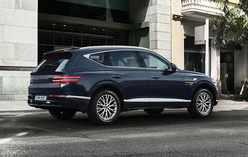 این چینش در نمای پشت نیز پیاده شده و چراغهای عقب هم از دو خط موازی تشکیل یافتهاند. بازی طراحان جنسیس با انواع خطوط و حجمها و نصب اسپویلر کوچک در انتهای سقف سبب شده این نما از سادگی بیش از حد فاصله بگیرد. GV80 در نمای جانبی از طراحی سادهای برخوردار است و رینگهای بزرگ 22 اینچی و نوار کرومی اطراف قاب شیشهها را میتوان المانهای شاخص نامید.