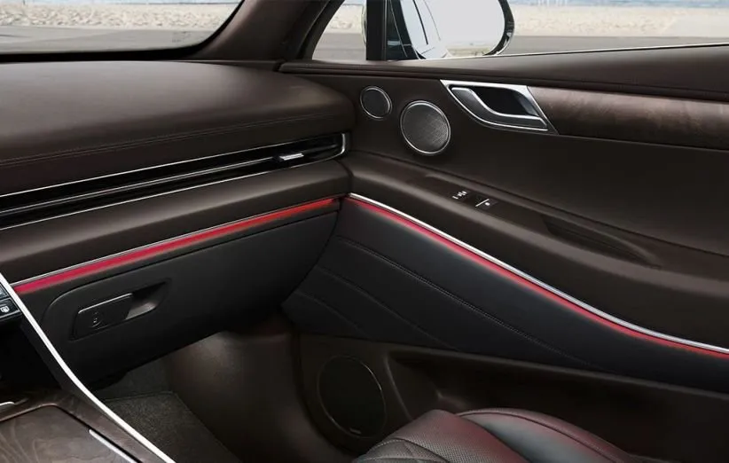 جنسیس GV80 در داخل کابین حرفهای زیادی برای گفتن در برابر رقبا دارد، چرا که در ساخت بخشهای مختلف از مواد با کیفیت استفاده شده و آیتمهای زیادی در لیست امکانات و تجهیزات ایمنی آن دیده میشوند. در قسمت فوقانی داشبورد شکیل این خودرو، یک نمایشگر عریض 14.5 اینچی نصب شده است. برای دسترسی راحت به این نمایشگر و کنترل سیستم اینفوتینمنت، مهندسین جنسیس یک پد لمسی را در کنسول میانی تعبیه کردهاند. این پد به فناوری تشخیص دست خط مجهز بوده و راننده میتواند با نوشتن روی آن مثلا مقصد را برای سیستم مسیریاب تعیین کند.