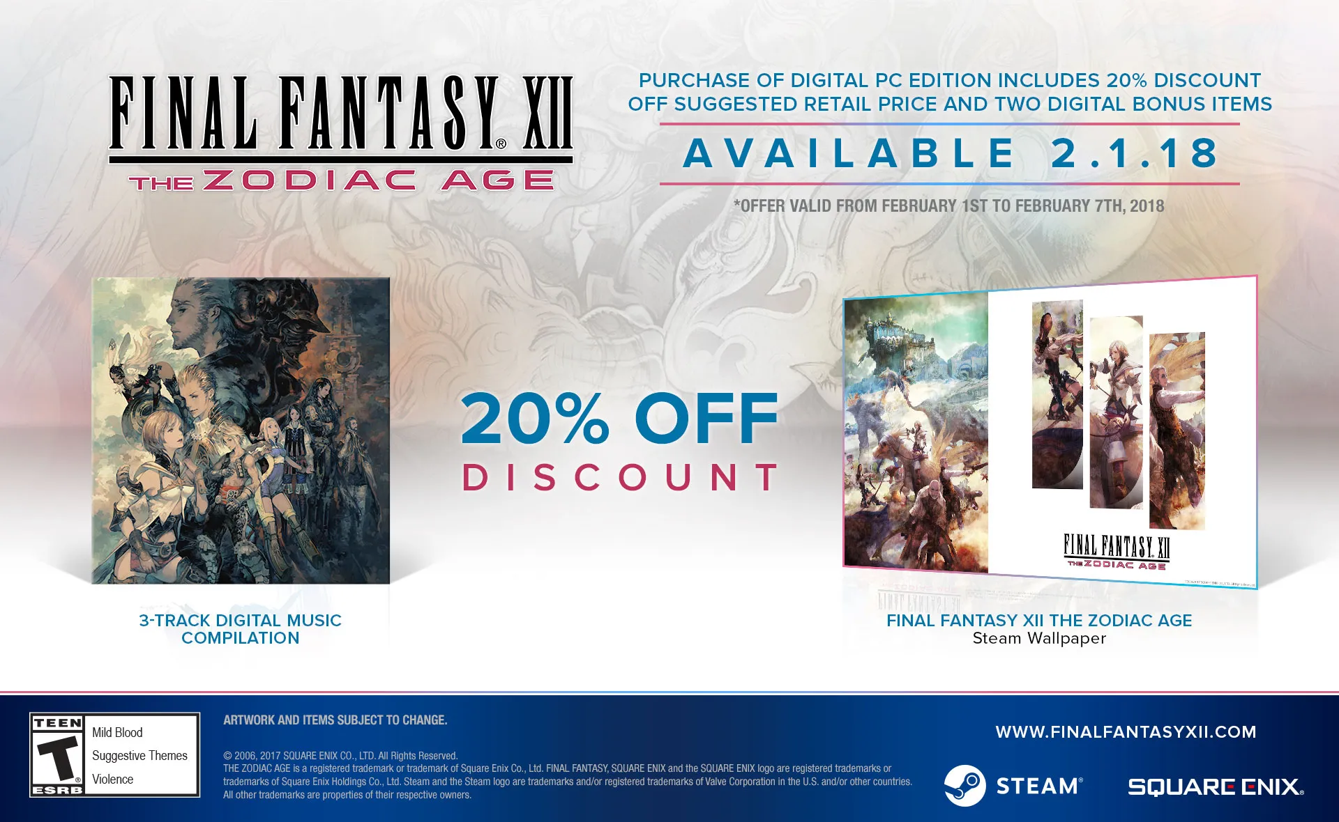 بازسازی فاینال فانتزی ۱۲ که در تابستان سال گذشته به اسم Final Fantasy XII: The Zodiac Age روی کنسول پلیاستیشن۴ عرضه شده بود، به زودی به کامپیوتر خواهد آمد. شرکت بازیسازی اسکوئر انیکس خبر داده است که Final Fantasy XII: The Zodiac Age در روز اول فوریه با قیمت ۴۹ دلار روی استیم عرضه میشود.