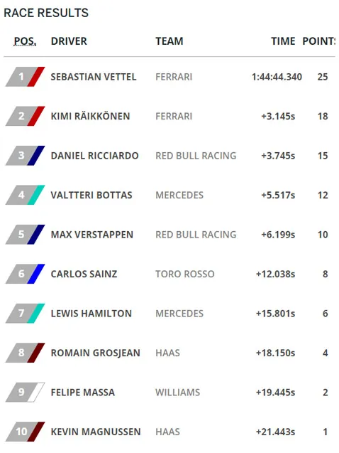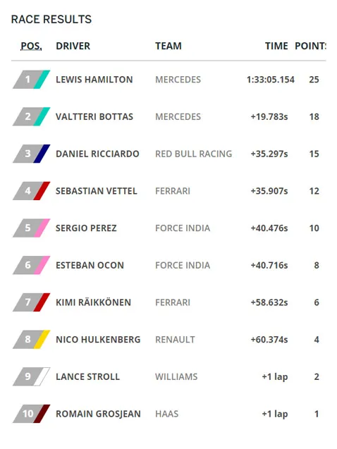 همانطور که میبینیم، لوییس همیلتون، راننده خوشنام مرسدس توانست با ثبت زمان 1 ساعت و 33 دقیقه و 5 ثانیه و 154 هزارم ثانیه، جایگاه اول این رقابت را تصاحب کند. والتری بوتاس، همتیمی همیلتون با اختلاف زمانی 19.783 ثانیه در جایگاه دوم قرار گرفت. دنیل ریکاردو از تیم ردبول با اختلاف 35.297 ثانیه مقام سوم را از آن خود کرد.