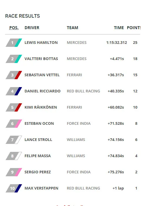 با توجه به نتایج به دستآمدهی امروز، همیلتون با 238 امتیاز و فتل با 235 امتیاز در صدر ردهبندی بهترین تیمهای فصل جاری قرار دارند. همچنین در جدول ردهبندی تیمهای امسال، تیم مرسدس و فراری توانستهاند به ترتیب با کسب 435 و 373 امتیاز در جایگاههای اول و دوم جای بگیرند. مرحلهی بعدی مسابقات، یکشنبه دو هفته دیگر یعنی 26 شهریور راس ساعت 16:30 در سنگاپور برگزار میشود.