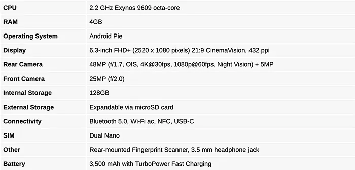 برای عکاسی، این گوشی از دوربین اصلی 48 مگاپیکسلی استفاده میکند. دوربین دوم One Vision نیز پنج مگاپیکسلی خواهد بود که برای سنجش عمق میدان در عکاسی پرتره کاربرد دارد. دوربین سلفی این گوشی که در داخل نمایشگر قرار گرفته نیز 25 مگاپیکسلی است. دوربین اصلی این گوشی، ویژگی به نام Night Vision دارد که به کاربر اجازه میدهد در شرایط نوری کم، عکسهای روشن و خیلی خوبی را ثبت کند. در زمینه فیلمبرداری نیز این دوربین میتواند با حداکثر رزولوشن 4K و با سرعت 30 فریم در ثانیه، فیلمبرداری داشته باشد. فیلمبرداری با رزولوشن 1080P و با سرعت 60 فریم در ثانیه نیز با دوربین اصلی این گوشی، امکانپذیر است. دیگر مشخصات فنی این گوشی را میتوانید در جدول زیر مشاهده کنید: