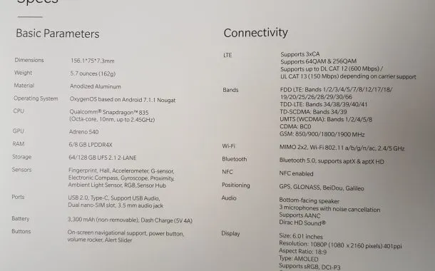 سوای صفحهنمایش بزرگتر و تغییر جایگاه حسگر اثر انگشت این گوشی جدید از نظر سختافزاری ویژگیهایی مشابه وانپلاس 5 دارد. مدل 5T از تراشه اسنپدراگون 835، دوربین دوتایی با مود مخصوص پرتره، باتری 3300 میلیآمپرساعتی و سیستم عامل Oxygen که بر پایه اندروید نوقا طراحی شده بهره میبرد. گوشی جدید وانپلاس در دو مدل با رم 6 گیگابایتی و حافظه 64 گیگابایتی و رم 8 گیگابایتی و حافظه 128 گیگابایتی به بازار عرضه خواهد شد.