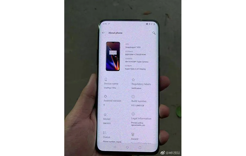 منبعی که این عکسها را در شبکه اجتماعی Weibo منتشر کرده، ادعا میکند که اسم کد این گوشی GM1915 خواهد بود. همچنین تصویری که از بخش مشخصات گوشی در اپلیکیشن ستینگ منتشر شده، نشان میدهد که این محصول نمایشگری 6.67 اینچی از نوع Super Optic خواهد داشت که برپایه AMOLED است. پردازنده این گوشی نیز اسنپدراگن 855 است و هشت گیگابایت حافظه رم در کنار 256 گیگابایت حافظه داخلی، در لیست مشخصات وان پلاس 7 دیده میشود. نکته هیجان انگیز، دوربینهای جدید این گوشی است که بالاخره شاهد دوربین سه گانه در این محصول هستیم. یک دوربین 48 مگاپیکسلی، یک دوربین 16 و یک دوربین 8 مگاپیکسلی در بخش پشتی وان پلاس 7 وجود خواهند داشت که احتمالا یکی از آنها زاویه عریض دارد. در نهایت نکته جالب دیگری که در این صفحه دیده میشود، نام گوشی است که OnePlus 7 Pro نوشته شده است.