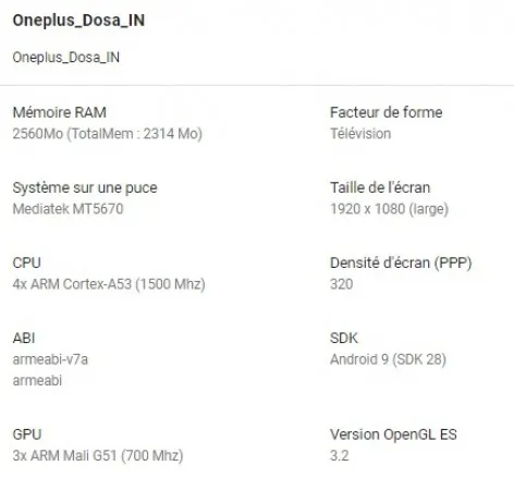 این اطلاعات به لطف اسکرین شاتی که از صفحه کنسول توسعه دهندگان گوگل پلی منتشر شده، لو رفته است. از اسم کد تلویزیون هوشمند وان پلاس TV گرفته که قرار است Dosa (نام یک غذا از جنوب کشور هند) باشد بگیرید، تا نوع پردازنده و گرافیک این تلویزیون، منتشر شده است.