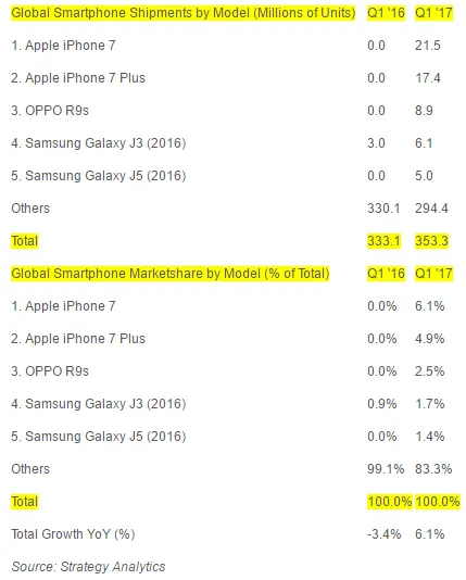 سازمان Strategy Analytics امروز پرفروشترین گوشیهای سه ماهه اول سال 2017 را اعلام کرد. براساس اطلاعات منتشر شده در سه ماهه اول سال 2017 نزدیک به 353.3 میلیون گوشی راهی بازار شده که افزایش 6.1 درصدی را در مقایسه با سال گذشته نشان میدهد. همچنین گفته شده که دو شرکت اپل و سامسونگ بیشترین گوشی موبایل را در این مدت زمان فروختهاند و شرکت چینی Oppo هم در مکان سوم قرار داشته است. در سه ماهه اول سال 2017 اپل نزدیک به 21.5 میلیون گوشی آیفون 7 و 17.4 میلیون آیفون 7 پلاس راهی بازار کرد. شرکت Oppo هم 8.9 میلیون دستگاه Oppo R9s فروخته است که قیمت آن نزدیک به 400 دلار میشود.