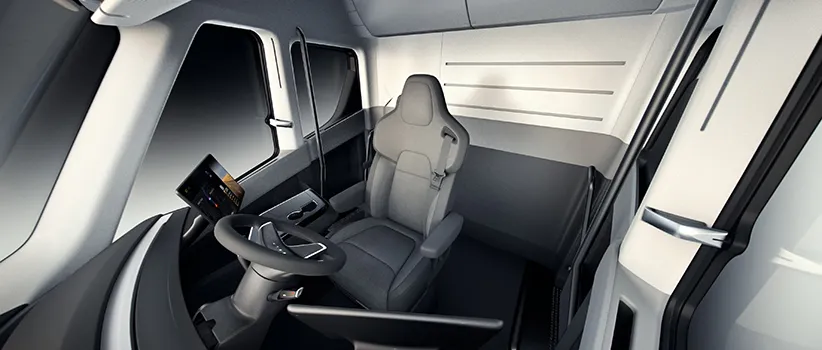 اساسا شرکت تسلا توجه ویژهای نسبت به طراحی خودرو نشان میدهد. در همین راستا طراحی داخلی این کامیونت بسیار لوکس و چشمنواز است. یکی از نکات جالب طراحی داخلی این خودرو محل قرارگیری صندلی راننده است. عموما صندلی راننده در یکی از طرفین خودرو قرار میگیرد اما در کامیونت تسلا این صندلی درست وسط کابین واقع شده است. این طراحی انجام شده تا از نظر میدان دید شرایط کاملا بهتری در اختیار راننده قرار گیرد. در اطراف صندلی راننده دو صفحهنمایش واقع شده که امکان دید نقاط کور و همچنین امکان مسیریابی را برای راننده فراهم میکنند. ایلان ماسک ادعا کرده شرکتش دقت زیادی را صرف ساخت یک محصول زیبا کرده است. او معتقد است هرینه کردن در زمینه زیبایی این کامیونت و ویژگیهای جذاب و لوکس آن لزوما ممکن است بازگشت مالی خیلی خوبی هم نداشته باشد. در واقع ماسک میگوید ممکن است خیلیها در یک کامیون دنبال چنین ویژگیهایی نباشند اما اساسا اگر قرار است محصولی تولید کنیم، باید محصولی زیبا بسازیم؛ حتی اگر این زیبایی لزوما بر فروش اثری نداشته باشد و آن را افزایش ندهد.