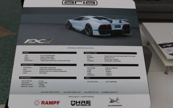 FXE خودروی سوپراسپرتی است که گروه آریا روی تیونینگ آن کار کرده است. این گروه توانستهاند از از موتور این خودرو حداکثر قدرت خروجی 1150 اسببخار و ماگزیمم گشتاور 1784 نیوتونمتری بگیرند. پیشرانهای که در قلب این سوپرکار قرار گرفته از نوع 8 سیلندر خورجینی با حجم 6.2 لیتر است. بجز این پیشرانهی بنزینی، یک موتور الکتریکی و یک باتری 10 کیلووات ساعتی قرار دارد. به طلف این تلاش مهندسی، رسیدن از وضعیت سکون به سرعت 96 کیلومتر بر ساعت تنها 2.7 ثانیه زمان میبرد و میتوان با این خودرو به حداکثر سرعت 338 کیلومتر بر ساعت رسید. برای کاهش وزن این خودرو، در بعضی قسمتها از اجزای تیتانیومی استفاده شده که به صورت سه بعدی پرینت گرفتهاند.