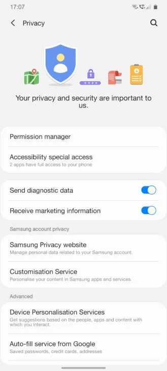 تنظیمات حریم خصوصی همانطور که از اسمش پیداست مربوط به فعالیت‌هایی است که به امنیت حریم خصوصی شما مرتبط است. اگرچه گزینه‌های بیشتری به نسبت قبل به آن افزوده نشده اما در عوض تمام تنظیمات حریم خصوصی را که در زیر-منوهای مختلف در اندروید 9 پنهان بودند در یک گروه جمع کرده است. از اجازه دسترسی گرفته تا سرویس auto-fill (تکمیل خودکار) در این بخش وجود دارد و کاربر می‌تواند تنها از طریق یک بخش به کلی از تنظیمات حریم شخصی خود دسترسی داشته باشد. بدیهی است در اختیار داشتن تمام تنظیمات در یک جا بسیار بهتر از این است که در جاهای مختلف به دنبال آن‌ها باشیم.