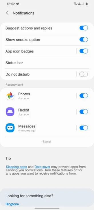 همچنین می‌توانید با ورود به لیست برنامه‌ها، برای هر کدام از آن‌ها تنظیمات خاصی را اعمال کنید که در درجه اول ممکن است فرایندی خسته کننده باشد اما مطمئن باشید ارزشش را خواهد داشت. هنگامی که گوشی طبق خواسته‌های شما تنظیم شود،‌‌ دیگر اعلانات غیر ضروری را در بالای صفحه مشاهده نمی‌کنید و فقط آن دسته از اعلانات مهم هستند که در آن قسمت قرار می‌گیرند.