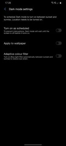 پیش‌تر فقط برنامه‌های از پیش نصب شده سامسونگ بودند که قابلیت تطبیق‌پذیری با تم گوشی را داشتند اما اکنون می‌بینیم که برنامه‌هایی چون اینستاگرام،‌‌‌‌‌‌‌ واتساپ، ردیت و بسیاری از برنامه‌های دیگر نیز از آن بهره می‌برند. حالت تیره یا همان Dark Mode در گوشی‌های سامسونگ درست در جایی قرار دارد که در سیستم عامل اندروید 9 حضور داشت و فقط یک گزینه اعمال برای تصویر زمینه هم در آن وجود دارد که خب اگر فعال کنید تغییر زیاد و چشمگیری روی تصویر زمینه شما پدید نمی‌آورد. برای دیگر گوشی‌ها نیز کافی است وارد تنظیمات شده و روی نمایشگر (Display) کلیک کنید تا به آن دسترسی داشته باشید.