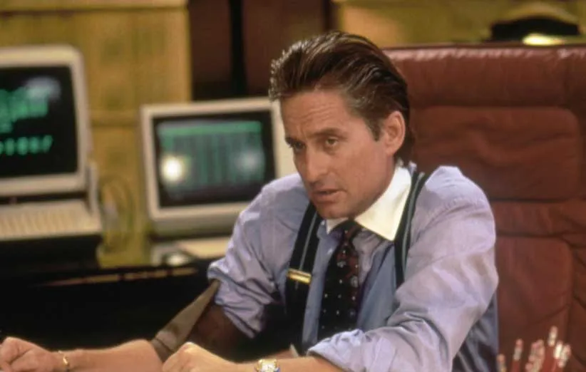 مایکل داگلاس در فیلم «وال استریت» نقش یکی از آدمهای گردن کلفت بازار سهام وال استریت را بازی میکند؛ مردی که در حرفهی خود بسیار محترم است و همه از او حساب میبرند. اما او از آن ثروتمندانی نیست که خیرش به همه میرسد، بلکه گرگ خوش پوشی است که برای رسیدن به موفقیت هر کاری میکند. او نماد جهان سرمایهداری است که به بهرهکشی از دیگران مشغول است و حاضر است برای دوام آوردن و ادامهی راه سیستم، هر ارزش اخلاقی را زیر پا بگذارد.
