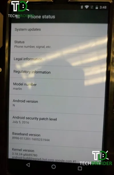 در این تصویر مشخص شده که اسم گوشی Marlin است و اندروید 7 روی آن نصب شده است. در اطلاعاتی که قبلا از این محصول لو رفته بود، گفته شده بود که نکسوس مارلین از یک صفحه نمایش 5.5 اینچی با کیفیت QHD، تراشهی چهار هستهای اسنپدراگون که به احتمال زیاد اسنپدراگون 820 یا 821 خواهد بود، بهره میبرد. این گوشی 4 گیگابایت رم خواهد داشت و دوربین 12 مگاپیکسلی در پشت و دوربین جلوی 8 مگاپیکسلی دارد.