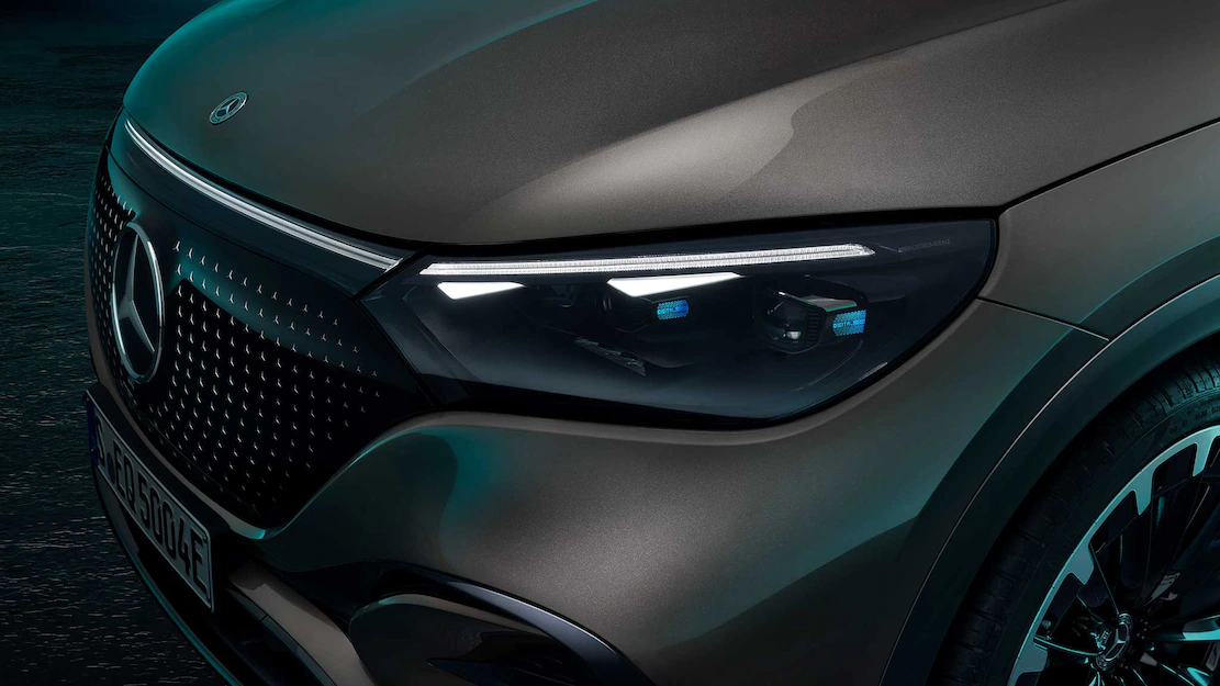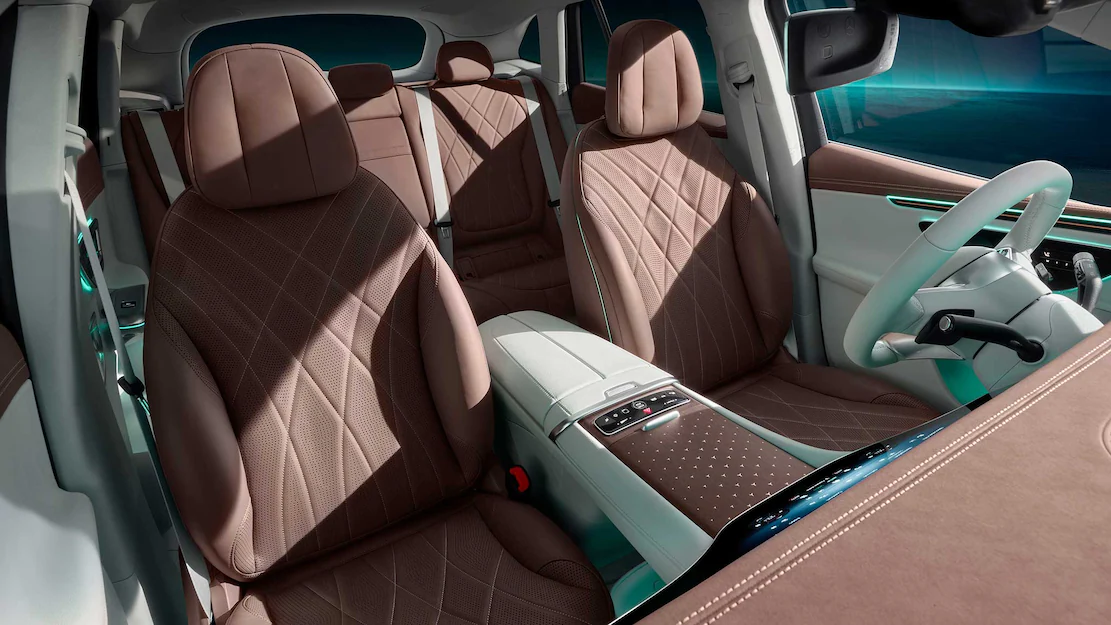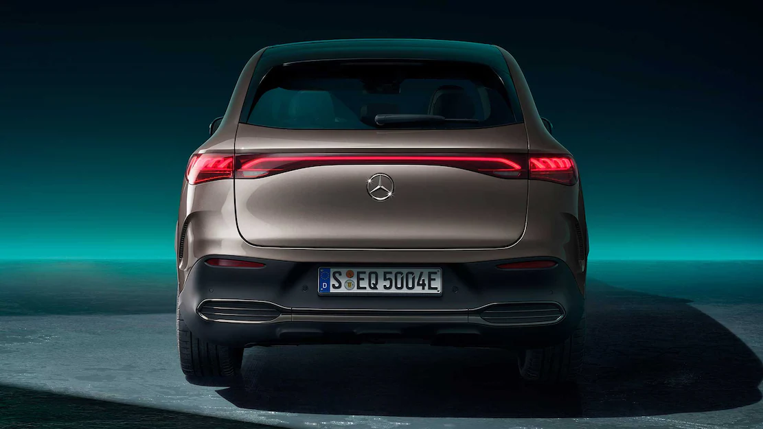 نمای جلوی خودرو هم با یک جلوپنجرهی مشکی براق بزرگ که چراغهای جلو به شکل بالدار و تمام-عرض در آن جای گرفتهاند، مشابه سدان EQE است. در عقب هم نوار چراغها بهصورت سراسری از عناصر LED سهبعدی و جلوههای حرکتی بهره میبرد.