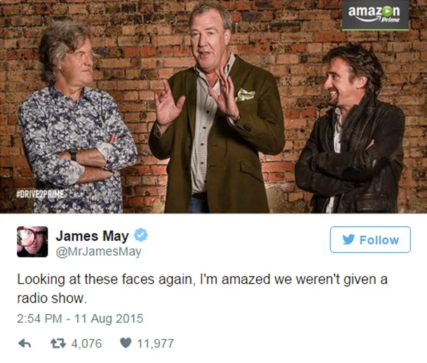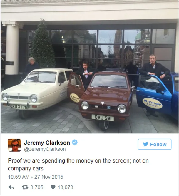 در عکس دیگر، کلارکسون و دو مجری دیگر را میبینیم، در حالی که جمعیت زیادی از عوامل فیلم در پشت آنها ایستادهاند؛ به علاوهی سه اتومبیل LaFerrari از شرکت فراری، McLaren P1 و پورشه ۹۱۸. در سری Top Gear، شبکهی BBC موفق نشده بود هیچکدام از این شرکتها را متقاعد کند تا اتومبیلهای مذکور را برای تست در برنامه شرکت بدهند. حالا آمازون موفق شده این سه مدل اتومبیل را برای مجریان تهیه کند و شوی جدید را با اینها کلید بزند.