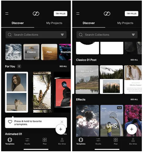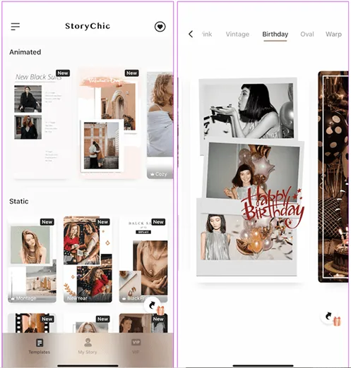 قالبها در دو سبک استاتیک و داینامیک موجود هستند. قالبهای داینامیک با جلوههای جالبی ارائه میشوند. جدا از نکات فوق، شما میتوانید ویژگیهایی مانند فیلترهای فردی، حالت استوری و پست و سایر بخشها را هم دریافت کنید.