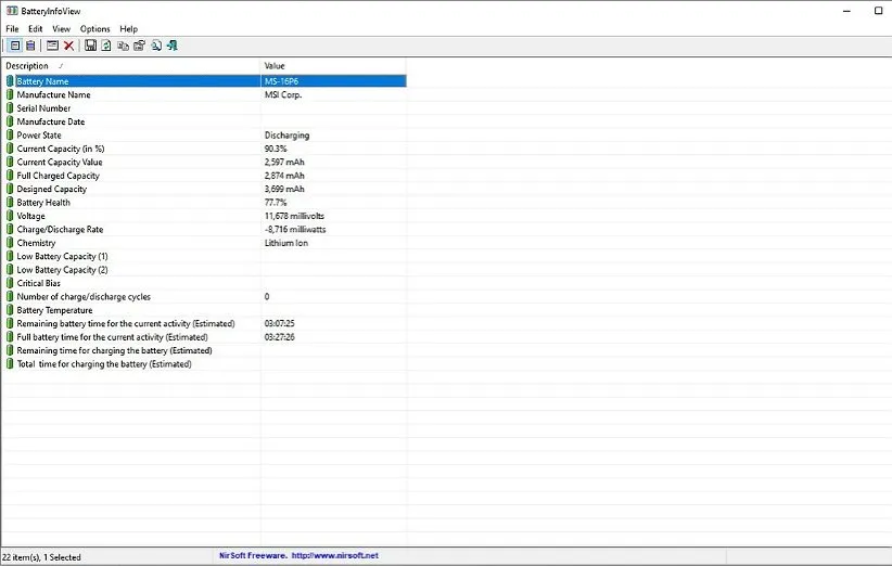 Batterinfoview نرمافزاری است که دادهها و اطلاعات جامعی دربارهی سلامت باتری لپتاپ شما در اختیارتان قرار میدهد. این نرمافزار رایگان اطلاعات خود را در دو صفحهی اصلی برای کاربران به نمایش میگذارد. در صفحهی اول (مسیر View > Show Battery Information) میتوانید اطلاعاتی در رابطه با ظرفیت طراحی شده، ظرفیت شارژ کامل، سلامت باتری، تعداد دفعات شارژ و دشارژ لپتاپ و… را بررسی کنید. صفحهی دوم (مسیر View > Show Battery Log) شامل تجزیه و تحلیل جامعی از وضعیت پاور، مقادیر شارژ و دیگر موارد است که به مرور زمان و با روشن شدن مجدد سیستم به این نرمافزار اضافه خواهد شد. بدین ترتیب با استفاده از این نرمافزار میتوانید مشکلات باتری خود را پیدا کنید. همچنین امکان دریافت اطلاعات در قالب فایل TXT یا CSV نیز وجود دارد.