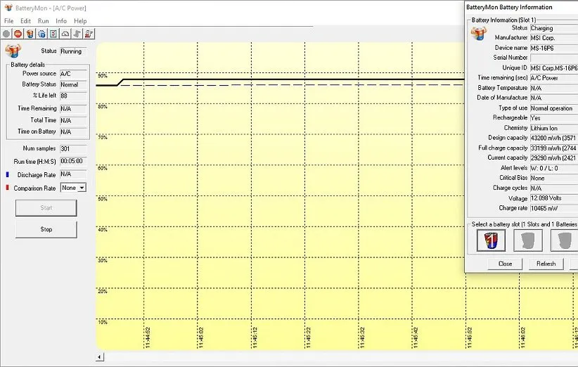 PassMark BatteryMon یک نرمافزار بسیار جالب و کاربردی برای مدیریت وضعیت باتری لپتاپ است. این نرمافزار به شما این امکان را میدهد که میزان شارژدهی باتری لپتاپ خود را در یک نمودار مشاهده و بررسی نمایید. در این نرمافزار محور افقی بیانگر زمان و محور عمودی بیانگر سطح شارژ است. همچنین میتوانید بازههای زمانی نمایش داده شده در این محورها را از مسیر Edit > Configuration تغییر دهید.