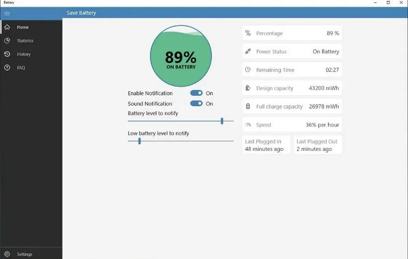 Save Battery یک نرمافزار ساده برای بررسی وضعیت سلامت باتری لپتاپ است که برای تبلتها و لپتاپهای سرفیس طراحی شده است. در صفحهی اصلی این نرمافزار شاهد رابط کاربری زیبا و مدرنی هستیم که وضعیت شارژ لپتاپ را به کاربران نشان میدهد. همچنین سایر اطلاعات باتری نظیر ظرفیت طراحی، ظرفیت شارژ کامل، آخرین زمان متصل شدن به شارژر و مدت زمان شارژ باقی مانده در این نرمافزار قابل دسترس است.