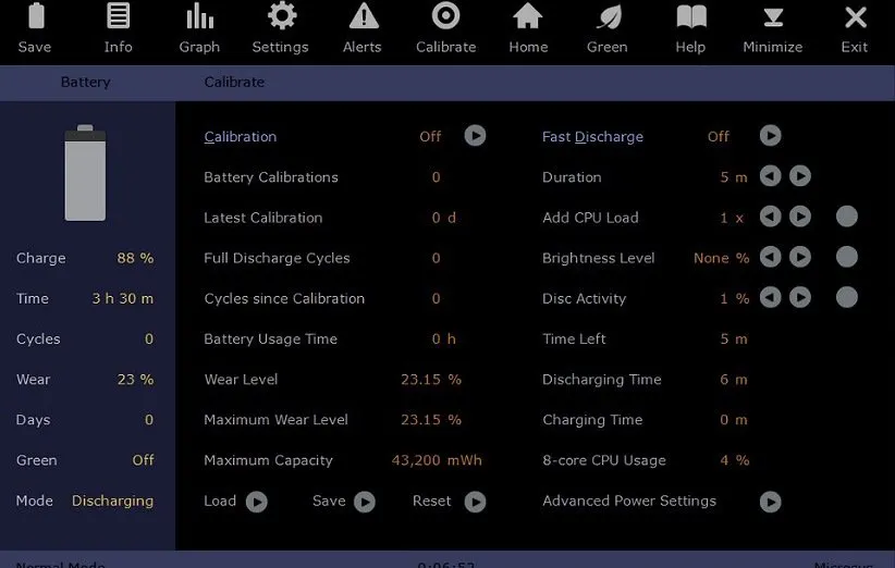 صفحهی Calibrate، اطلاعاتی دربارهی فرسودگی باتری لپتاپ شما نظیر زمان استفاده، وضعیت باتری، شمارش چرخه سیکل باتری و موارد دیگر را ارائه میدهد. همچنین کاربران میتوانند هر یک از اطلاعات مد نظر خود را ذخیره کنند. این افراد قادر خواهند بود با فعالسازی ابزار باتری این نرمافزار اطلاعاتی مانند ظرفیت باتری، زمان باقی مانده تا اتمام شارژ و از این قبیل را مشاهده کنند. رابط کاربری مدرن این نرمافزار به کاربران این امکان را میدهد تا جزئیات مناسبی از باتری سیستم خود را در طول یک دورهی 16 ساعته زیر نظر بگیرند.