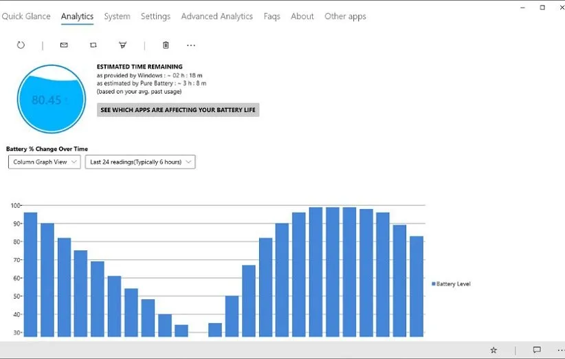 Pure Battery Analytics، یک نرمافزار بسیار کاربردی برای بررسی وضعیت سلامت باتری لپتاپ است. در صفحه Quick glance میتوان وضعیت دقیق باتری، تنظیمات وضعیت باتری، شارژ کامل و ظرفیت اولیهی آن را بررسی کرد. در صفحهی Analytics تغییرات صورت گرفته در درصد شارژ باتری در طول زمان قابل مشاهده است. این نرمافزار قادر است تا میزان مصرف باتری را در واحد زمان در 4 حالت مختلف شامل نمودار میلهای، نمودار ستونی، نمودار خطی و حبابی به کاربران ارائه کند.