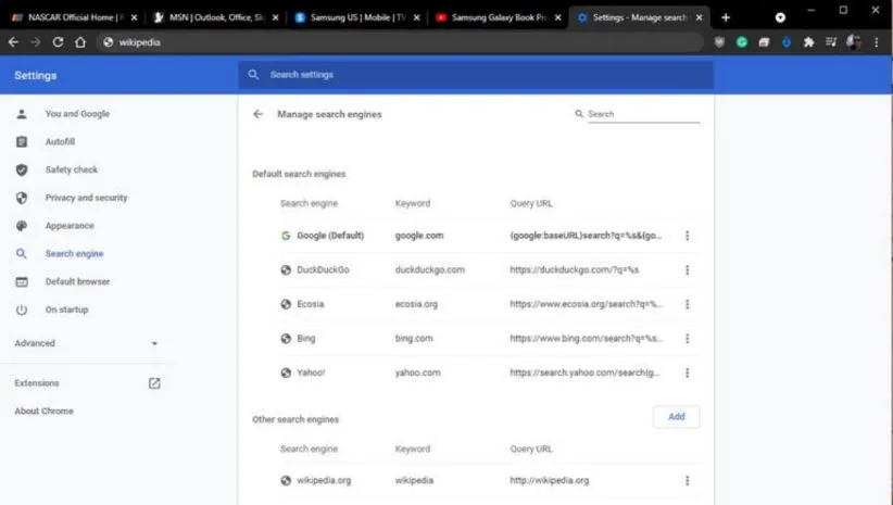 برای تعیین موتور جستوجوی پیشفرض به صورت دستی، لازم است روی آیکن سهنقطه عمودی در کنار آیکن پروفایلتان کلیک کنید و سپس به سراغ گزینه Settings بروید. از اینجا باید گزینه Search Engine را در نوار کناری انتخاب کنید. سپس روی Manage Search Engine و در نهایت Add کلیک کنید. در تصویر بالا ویکیپدیا به صورت دستی اضافه شده و از این به بعد هربار که Wikipedia را درون نوار آدرس تایپ کنید، یک گزینه برای جستوجو داخل ویکیپدیا به نمایش درمیآید.