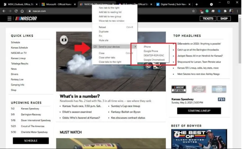 برای این کار کافی است که خیلی ساده روی روی تب مد نظرتان در بالای نوار تبهای گوگل کروم راست کلیک کنید. از اینجا، قادر به انتخاب گزینهی Send to Your Devices خواهید بود. سپس لیستی از دیوایسهایی که کروم روی آنها نصب است به نمایش در میآید و میتوانید لینک را به سرعت از اینجا ارسال کنید. فقط اطمینان حاصل کنید که کروم روی دیوایس مقصد فعال است.