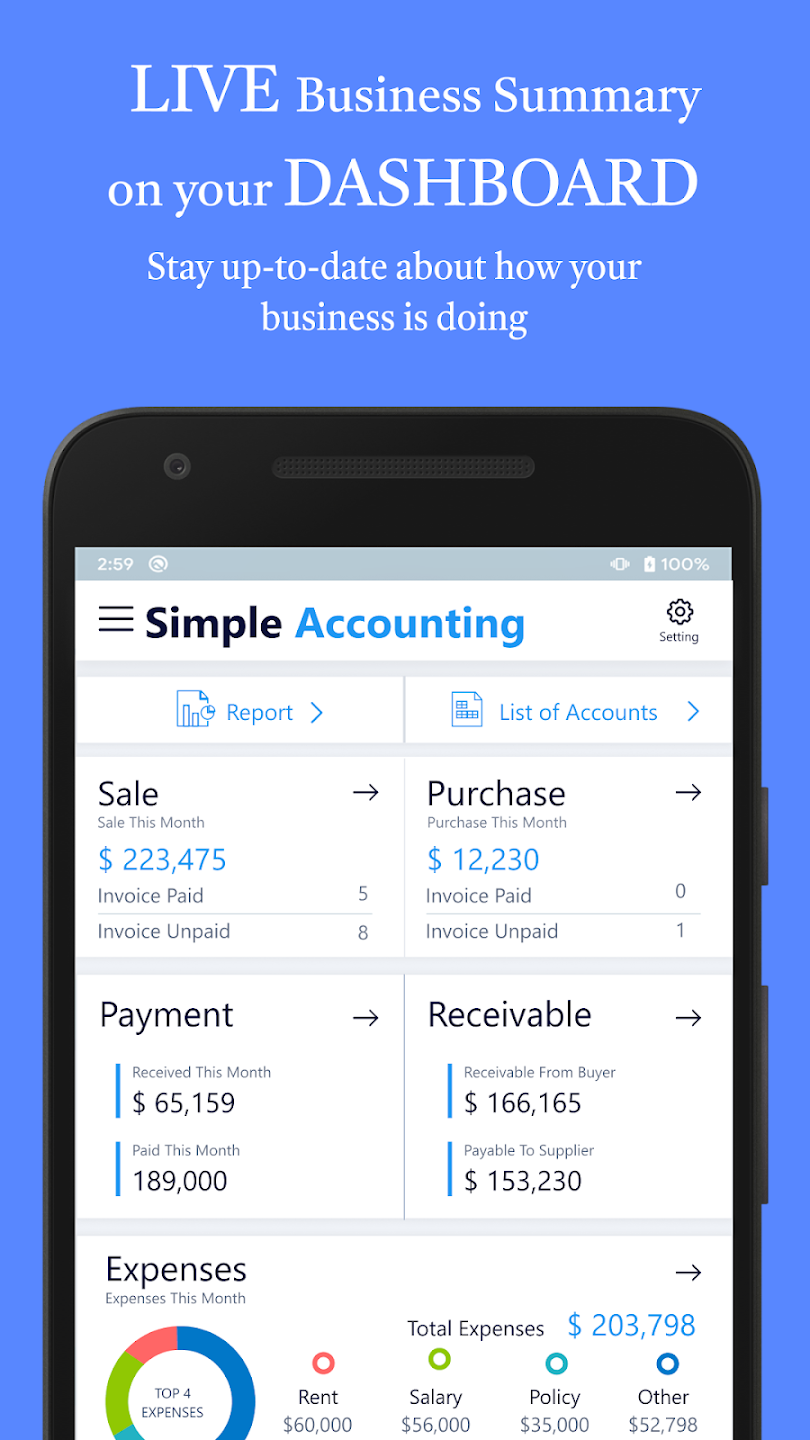 Accounting Bookkeeping، به عنوان یک اپلیکیشن حسابداری اندروید قدرتمند و کاربردی، با ارائه مجموعهای جامع از ابزارها و امکانات حسابداری، به شما کمک میکند تا به سادگی و بدون نیاز به دانش تخصصی حسابداری، امور مالی کسب و کار خود را مدیریت کنید. این اپلیکیشن، با تمرکز بر سادگی و کارایی، به شما این امکان را میدهد تا تمام معاملات خود، از فروش و خرید گرفته تا پرداختها و هزینهها و مالیات، را به روشی بسیار ساده ثبت کنید.