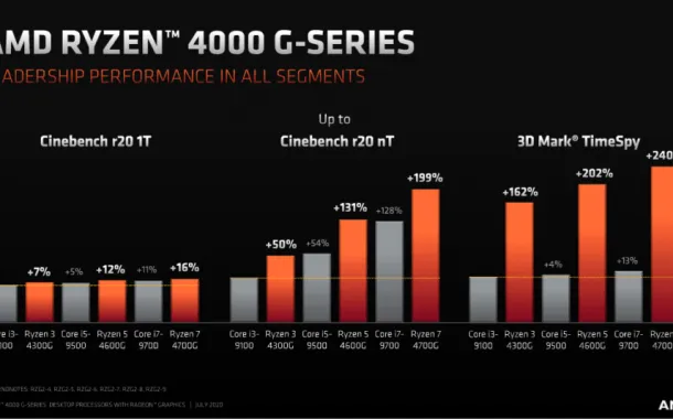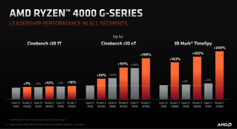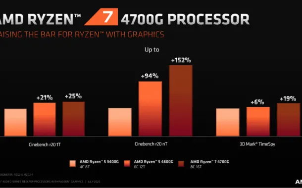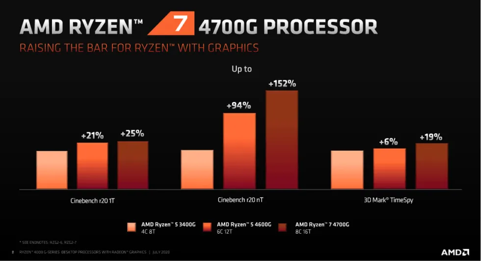 در رابطه با عملکرد این پردازندهها، AMD هیچ خبر قطعی منتشر نکرد اما این نکته را یادآور شد که رایزن 4000 سری G دو برابر سریعتر از سری اینتل vPro هستند. در تصویر بالا هم شاهد این ادعا بودیم که پردازندههای جدید 2.5 برابر از پردازندههای سری رایزن 3000 عملکرد بهتری دارند. اما این عدد در حالی بدست آمده که رایزن 7 4700G با رایزن 5 3450G مقایسه شده و نه رایزن 7 3700X. به همین خاطر در بنچمارک Cinebench R20، حدودا 152 درصد امتیاز بهتری کسب کرد. اما قطعا این اصلا مقایسه درستی نیست و بنابراین باید برای بررسی دقیقتر، منتظر عرضه آنها به بازار شویم. ولی خب سوال بزرگی که پیش میآید این است که چرا AMD چنین مقایسهای را انجام داده؟
