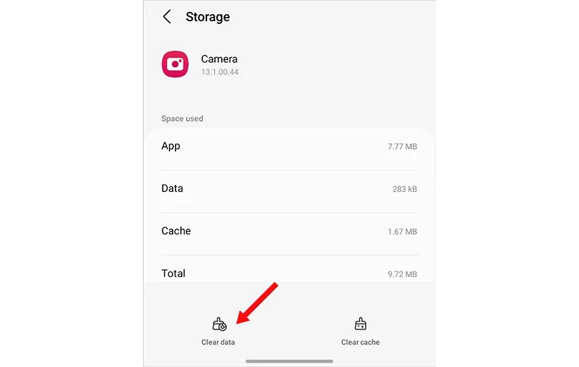 این اقدام باعث نمایش یک صفحه جدید میشود مبنی بر این که چه میزان فضای ذخیرهسازی توسط دوربین اشغال میشود. روی دکمه Clear Data ضربه بزنید. این رویه موجب میشود با پاکسازی کش و دیتای اپلیکیشن، دوربین مجدد سر حال اجرا شود.