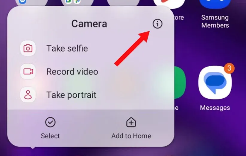 مجوزها برای برنامه دوربین شاید به طور سهوی لغو شده باشند. برای دسترسی به تمام گزینههای دوربین بهتر است تمام گزینهها را روشن نگه دارید. برای انجام این کار، شما باید انگشتتان را روی آیکون دوربین نگه داشته تا یک منوی جدید ظاهر شود. روی App info یا آیکونی که دارای حرف i در داخل یک دایره است ضربه بزنید.