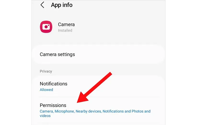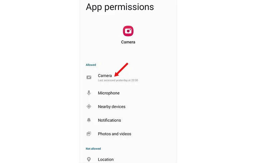 از این موضوع اطمینان حاصل کنید که تمام دسترسیهای مورد نیاز به برنامهی دوربین اعطا شه باشد. روبهروی گزینهها باید Allowed حک شده باشد.