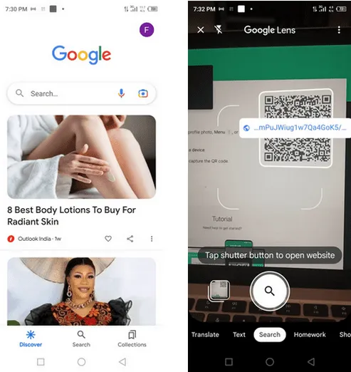 با اجرای برنامه گوگل و سپس ضربه زدن روی آیکن دوربین در نوار جستوجوی گوگل، این روش را امتحان کنید. با اجرای برنامهی گوگل لنز، دستگاهتان را به سمت کد کیو آر نشانه بگیرید. این برنامه باید کد شما را شناسایی کرده و سپس به طور اتومات وارد لینک شود.