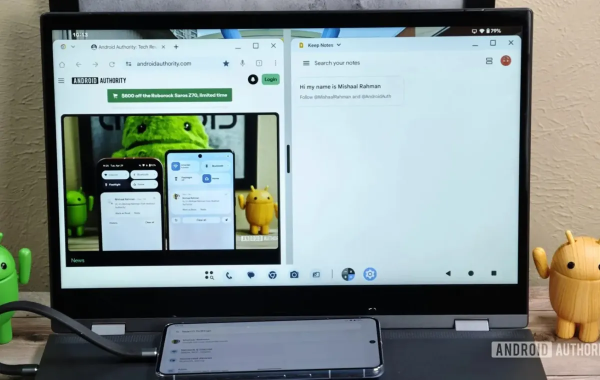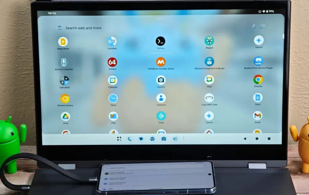 اکنون این دو تجربه با ویژگی «حالت پنجرهای دسکتاپ روی نمایشگرهای ثانویه» در حال ترکیب شدن هستند. وبسایت Android Authority phgh این گزینهی توسعهدهنده را با آخرین بتای اندروید 16 فعال کرده است. یک گوشی پیکسل (8 پرو) متصل به لپتاپ، تسکبار اندروید را همراه با برنامههای پین شده و اخیر، و همچنین دسترسی به لانچر و ناوبری 3 دکمهای در سمت راست نشان میدهد.