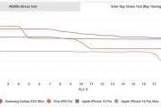 اما در تست Solar Bay که فناوری رهگیری پرتو استفاده میشود، A17 پرو عملکرد ضعیفتر از خود نشان میدهد. با وجود اینکه این تراشه در ابتدا نسبت به اسنپدراگون 8 نسل 2 و دایمنسیتی 9200 بهتر ظاهر شده، ولی فقط بعد از 1 دقیقه افت 27 درصدی پیدا میکند. این در حالی است که اسنپدراگون 8 نسل 2 برای مدت بسیار طولانیتری میتواند پردازشهای مربوط به رهگیری پرتو را با سرعت بهتری انجام دهد.