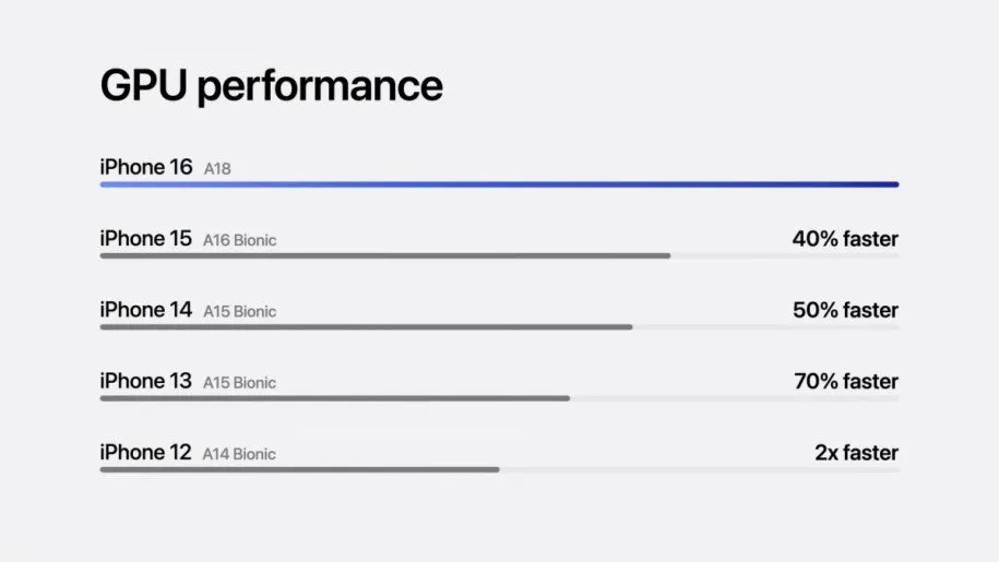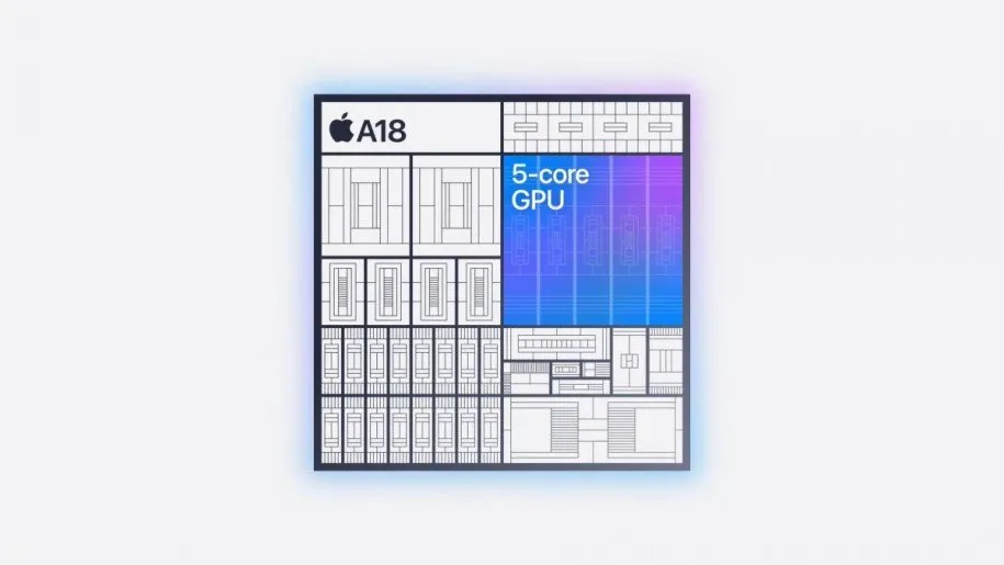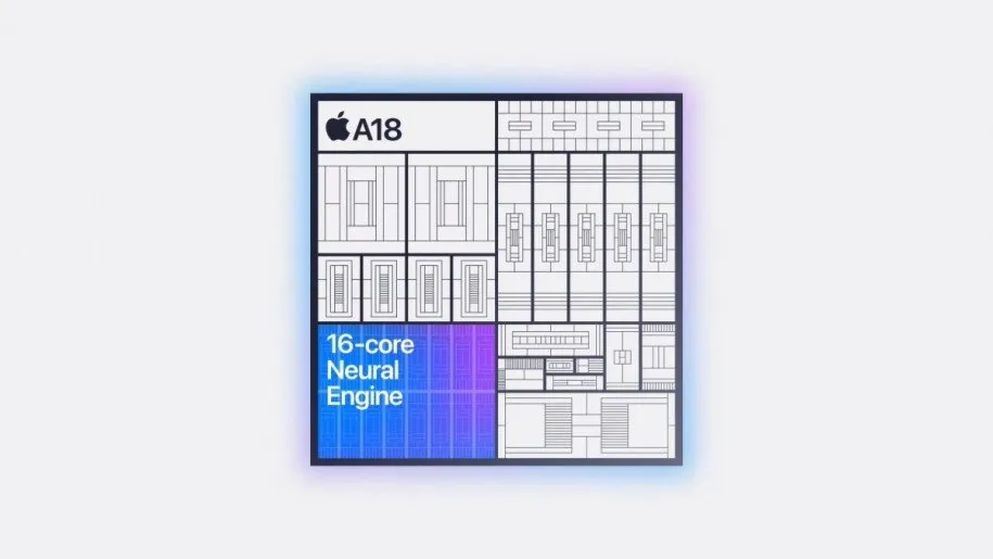 چیپست A18 نیز مثل مدل پرو از بهبودهای قابل توجهی برخوردار است و از همان معماری شش هستهای با پردازندهای مشابه با مدل پرو بهره میبرد. این چیپست نسبت به A16 بایونیک که در مدلهای آیفون 15 و 15 پلاس استفاده شده بود، 30٪ سریعتر است و برای همان وظایف، 30٪ انرژی کمتری مصرف میکند.