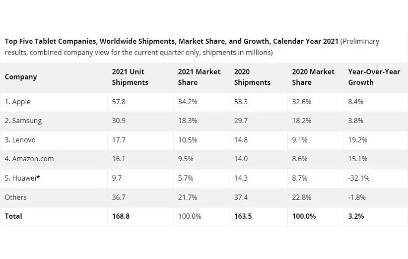 شرکت لنوو در حالی با عرضهی با 17٫7 میلیون تبلت در سال 2021 رتبهی سوم این لیست را در اختیار دارد که در مقایسه با سال 2020 این نرخ با رشد 19٫2 درصدی همراه بوده است. این شرکت در سه ماههی آخر سال 2021 4٫6 میلیون تبلت را روانهی بازار کرد، در حالی این نرخ در سه ماههی آخر سال 2020 تنها 1٫6 میلیون بوده است.