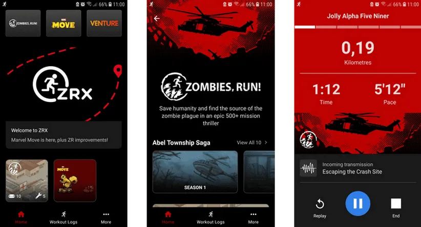 احتمالا شناختهشدهترین خط داستانی، Zombies, Run! است. این حالت داستانی یک برنامهی دویدن برای مبتدیان است که به کاربرها اجازه میدهد با تاکتیکهای مختلف در طول یک مسیر بدوند. در واقع، زنده ماندن شما از دست زامبیها با انجام طیف متنوعی از ماموریتهای خطرناک، هدف اصلی این داستان به شمار میرود.
