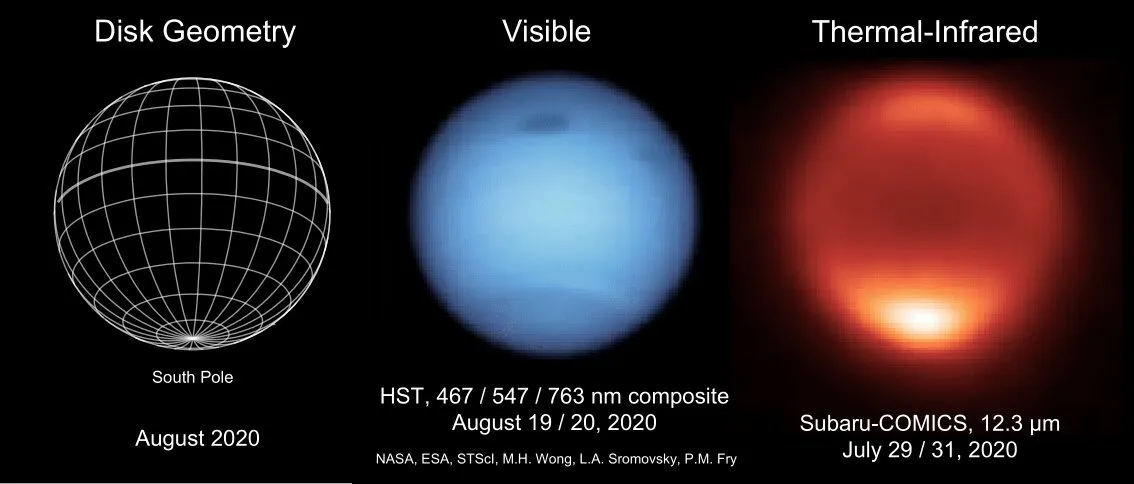 هندسهی نپتون و چهرهی آن در طیف مرئی و فروسرخ در سال 2020؛ گرمایش قطب جنوب آن بهوضوح مشخص است.